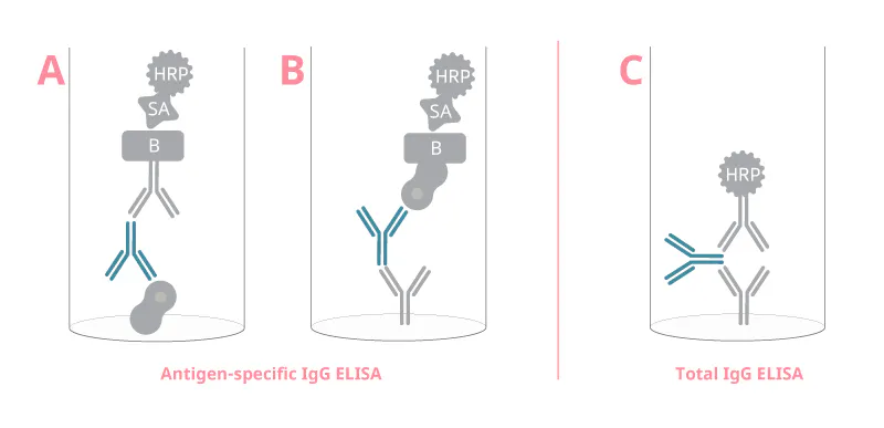 圖 1. ELISA 中檢測 IgG 的三種不同設置的測定原理??乖禺愋?IgG 可以通過 A) 間接或 B) 反向設置進行檢測,總 IgG 可以通過 C) 夾心設置進行檢測。這是 IgG 評估的示例;可以使用相應的測定抗體對該測定進行修改以檢測其他 Ig 同種型或亞類。