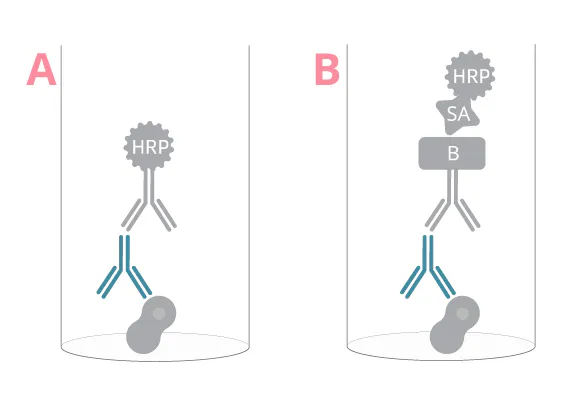 典型的夾心測定設置可用于檢測相同同種型(也稱為類)或相同抗體亞類的抗體(圖 1C、圖 3)。為此,您需要一對特異于 Ig Fc 部分(抗體骨架)的匹配抗體對,以區分同種型或亞類。將捕獲抗體包被到 ELISA 板后,樣品中的 Ig 將被特定包被 mAb 捕獲,然后在下一步中被檢測抗體夾在中間。由于 Ig 同種型通常在血液樣本中含量豐富,因此一步檢測設置(圖 3A)可能優于兩步檢測(圖 3B),因為不需要信號放大。IgE 是一個例外,由于其在人體中的豐度較低,因此應使用兩步 ELISA 進行分析。