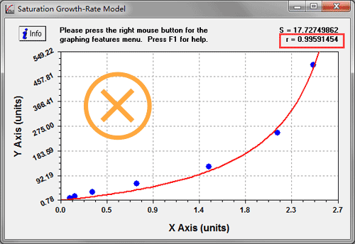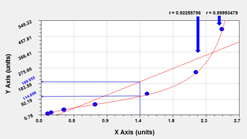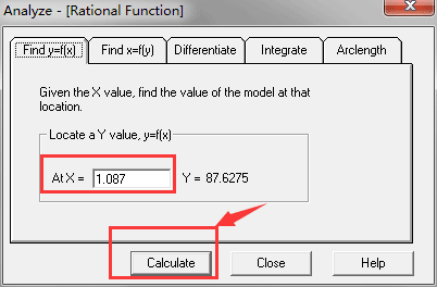 該軟件可以輕松定位 x/y 點、微分以及通過從繪圖菜單中選擇“分析”或按 Ctrl-L 執行的曲線擬合積分。在此示例中,我們希望通過評估給定 OD(X 值)下的曲線擬合來找到目標蛋白的濃度(Y 值)。只需在“At X=”字段中輸入要評估曲線擬合的點(x 值),然后按鍵盤上的[ Calculate ] 或 [ Enter ]。然后計算器將顯示相應的 y 值。