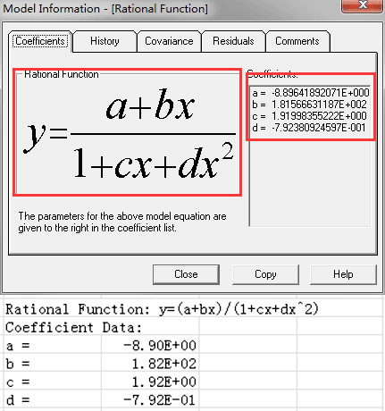 系數部分給出當前模型的相關參數值——這些系數始終表示為 a、b、c、d 等。這些系數與模型部分中顯示的模型相匹配。如果系數列表超出了它們顯示的窗口范圍,則會出現一個滾動條,允許您滾動瀏覽參數。