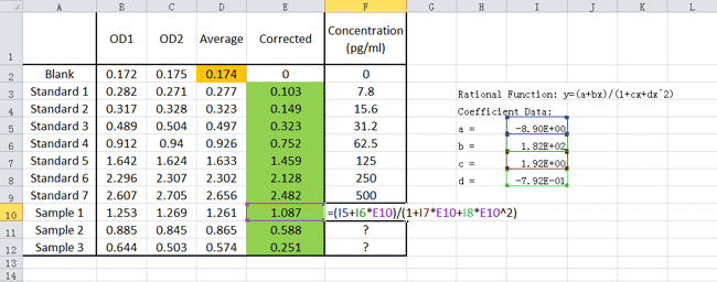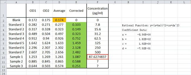 將X(OD)、a、b、c、d值分別帶入公式中,然后按鍵盤上的[ Enter ]鍵即可計算出濃度。為了得到最準確的結果,建議預先確定合適的稀釋倍數,確保稀釋后樣品中目標蛋白的濃度落在標準曲線范圍內。如果樣品已被稀釋,則計算時應考慮稀釋因子。
