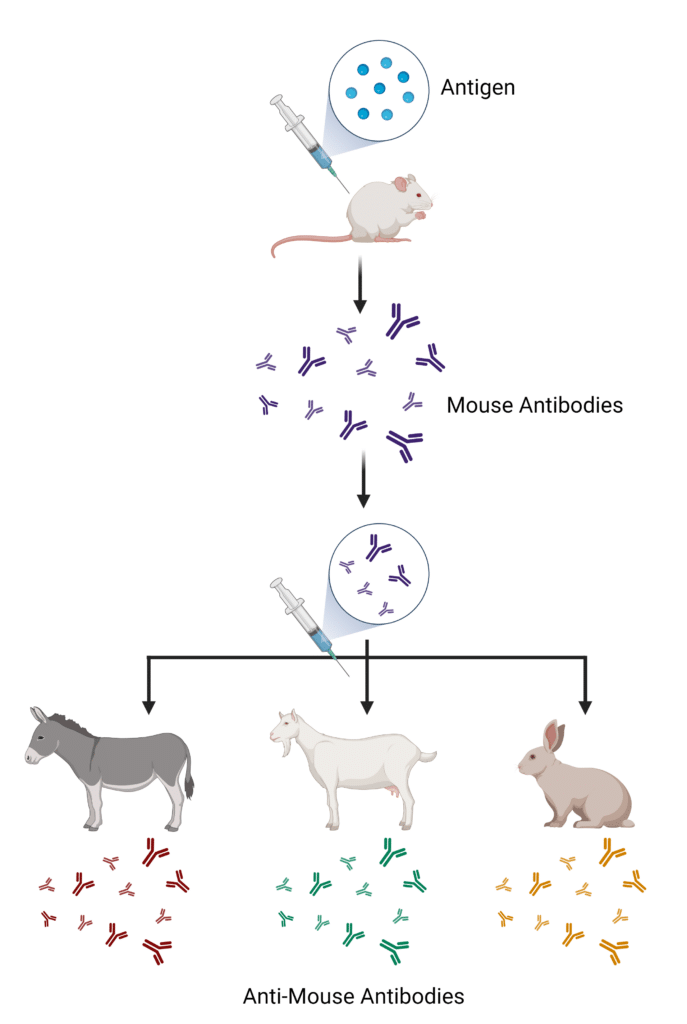 二抗是通過使用不同目標動物物種的抗體對宿主動物進行免疫而產生的(圖 2)。例如,通過將兔抗體注射到山羊體內,產生山羊抗兔抗體,從而產生抗兔二抗。二抗生產的常見宿主物種包括山羊、驢和兔子。針對目標物種的混合抗體生成二抗,形成二抗的多克隆混合物,可識別宿主物種的重鏈 (HC) 或輕鏈 (LC)、Fab 和 Fc 區上的表位。減少二抗的交叉反應性可以通過用特定抗體片段免疫宿主來實現,從而產生針對特定區域的二抗,例如僅HC或LC,或Fab片段。從宿主中純化后,抗體標記會與二抗結合。