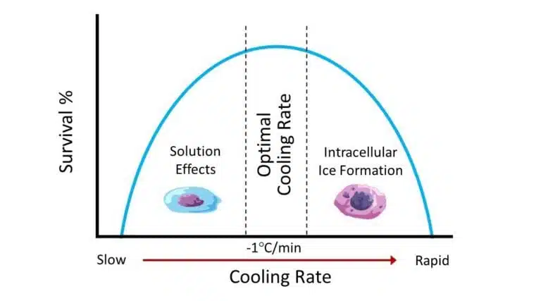 實際上,非??旌头浅B睦鋬鏊俣榷紩?dǎo)致過量冰形成或溶質(zhì)毒性增加。DMSO等冷凍保護劑可促進脫水、減少冰結(jié)晶并降低溶質(zhì)效應(yīng)。對于大多數(shù)細(xì)胞來說,最佳冷凍速度是每分鐘1°C。正如您在圖表中看到的,在這個溫度范圍內(nèi),細(xì)胞內(nèi)冰形成的負(fù)面影響與溶質(zhì)濃度的增加達到平衡。