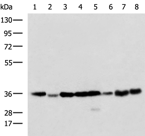 Hela cell, Mouse brain tissue, 231, Jurkat, Raji, 293T, A375 and HUVEC cell lysates |
