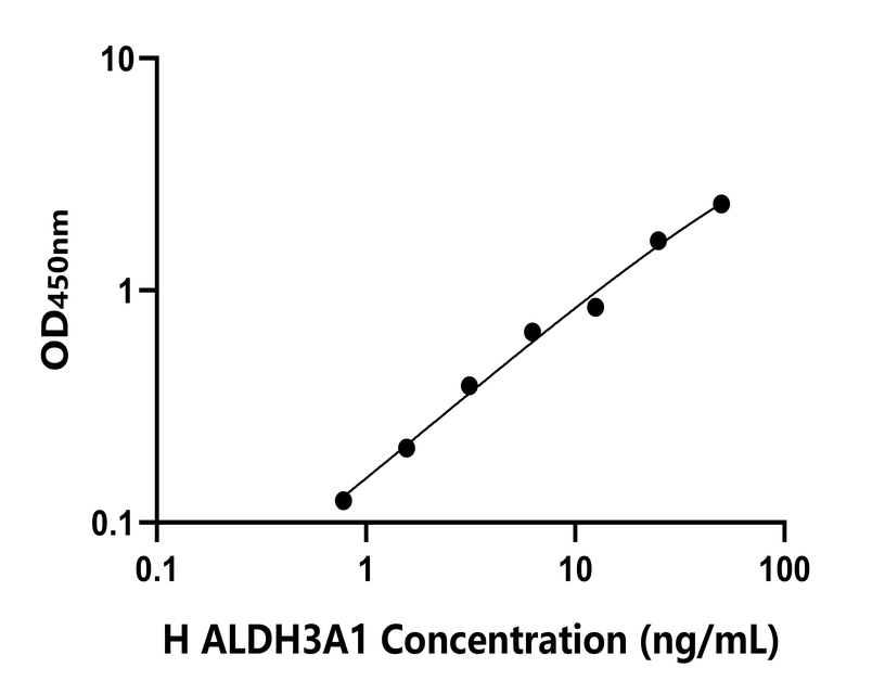 本試劑盒采用雙抗體夾心法ELISA技術 : 將捕獲抗體包被于酶標板上,捕獲樣品及標準品中的待測物ALDH3A1,清洗后,再加入生物素標記的檢測抗體進行孵育后清洗,形成“捕獲抗體-抗原-檢測抗體”免疫復合物,隨后加入鏈霉親和素偶聯的辣根過氧化物酶進行孵育,待孵育結束后清洗,接著加入TMB顯色后,若樣本中有待測物則顯藍色,加入終止液停止反應。檢測過程中游離的成分均被洗去,用酶標儀在450 nm處測OD值,顏色的深淺和樣品中的待測物的含量呈正比,通過繪制標準曲線計算出樣本中ALDH3A1的濃度。
