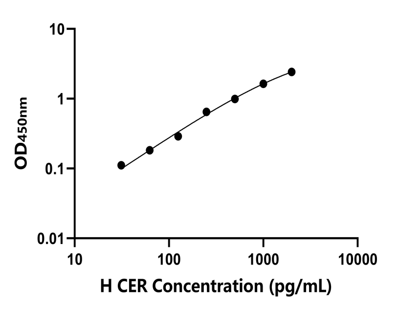 本試劑盒采用雙抗體夾心法ELISA技術 : 將捕獲抗體包被于酶標板上,捕獲樣品及標準品中的待測物CER,清洗后,再加入生物素標記的檢測抗體進行孵育后清洗,形成“捕獲抗體-抗原-檢測抗體”免疫復合物,隨后加入鏈霉親和素偶聯的辣根過氧化物酶進行孵育,待孵育結束后清洗,接著加入TMB顯色后,若樣本中有待測物則顯藍色,加入終止液停止反應。檢測過程中游離的成分均被洗去,用酶標儀在450 nm處測OD值,顏色的深淺和樣品中的待測物的含量呈正比,通過繪制標準曲線計算出樣本中CER的濃度。