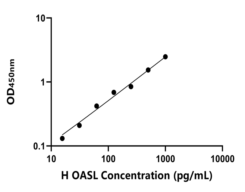 本試劑盒采用雙抗體夾心法ELISA技術 : 將捕獲抗體包被于酶標板上,捕獲樣品及標準品中的待測物OASL,清洗后,再加入生物素標記的檢測抗體進行孵育后清洗,形成“捕獲抗體-抗原-檢測抗體”免疫復合物,隨后加入鏈霉親和素偶聯的辣根過氧化物酶進行孵育,待孵育結束后清洗,接著加入TMB顯色后,若樣本中有待測物則顯藍色,加入終止液停止反應。檢測過程中游離的成分均被洗去,用酶標儀在450 nm處測OD值,顏色的深淺和樣品中的待測物的含量呈正比,通過繪制標準曲線計算出樣本中OASL的濃度