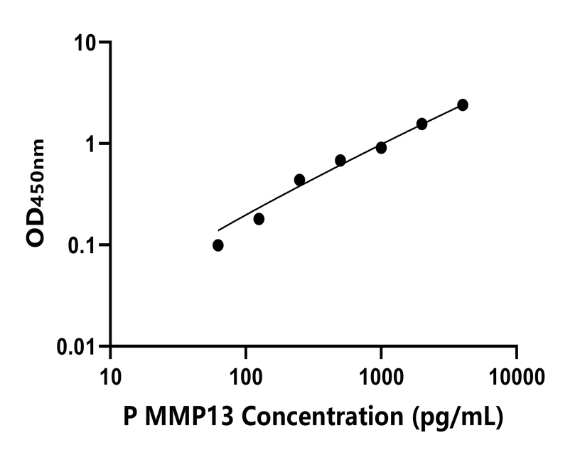 本試劑盒采用雙抗體夾心法ELISA技術(shù) : 將捕獲抗體包被于酶標(biāo)板上,捕獲樣品及標(biāo)準(zhǔn)品中的待測物MMP13,清洗后,再加入生物素標(biāo)記的檢測抗體進(jìn)行孵育后清洗,形成“捕獲抗體-抗原-檢測抗體”免疫復(fù)合物,隨后加入鏈霉親和素偶聯(lián)的辣根過氧化物酶進(jìn)行孵育,待孵育結(jié)束后清洗,接著加入TMB顯色后,若樣本中有待測物則顯藍(lán)色,加入終止液停止反應(yīng)。檢測過程中游離的成分均被洗去,用酶標(biāo)儀在450 nm處測OD值,顏色的深淺和樣品中的待測物的含量呈正比,通過繪制標(biāo)準(zhǔn)曲線計算出樣本中MMP13的濃度。