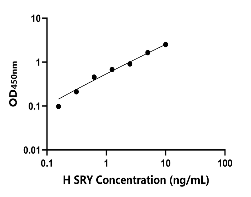 本試劑盒采用雙抗體夾心法ELISA技術 : 將捕獲抗體包被于酶標板上,捕獲樣品及標準品中的待測物SRY,清洗后,再加入生物素標記的檢測抗體進行孵育后清洗,形成“捕獲抗體-抗原-檢測抗體”免疫復合物,隨后加入鏈霉親和素偶聯(lián)的辣根過氧化物酶進行孵育,待孵育結束后清洗,接著加入TMB顯色后,若樣本中有待測物則顯藍色,加入終止液停止反應。檢測過程中游離的成分均被洗去,用酶標儀在450 nm處測OD值,顏色的深淺和樣品中的待測物的含量呈正比,通過繪制標準曲線計算出樣本中SRY的濃度。